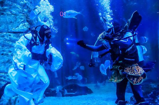 在长达40.809米的世界吉尼斯世界纪录展示缸内,为了更好地呈现生动的演出,潜水员、美人鱼演员均多次反复排练,以达到良好的演出效果。